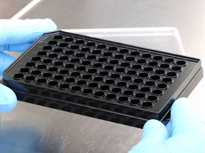 高通量細胞分析實驗用黑色平底透明96孔板,圓形孔,玻璃底