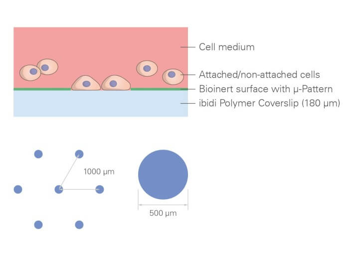 ibidi µ-Patterning技術為各種球體和類器官應用提供空間限定的細胞粘附區(qū)域。微型粘附圖案被不可逆地壓印在ibidi Polymer聚合物蓋玻片的Bioinert生物惰性非粘附性表面上,從而可以精確控制細胞粘附。µ-Pattern具有干燥穩(wěn)定性、無菌性和即用性。ibiTreat µ-Pattern圖案在相差顯微鏡下弱可見,但在熒光顯微鏡下不可見。