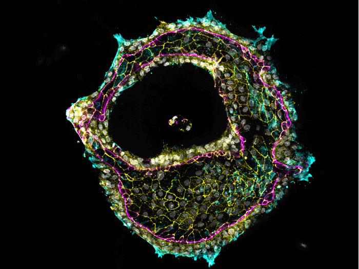 在µ-Slide 8 Well high 用膠原蛋白I涂覆的ibiTreat µ-Pattern(cir500,pit1000)上培養(yǎng)的成人來源干細胞類器官。細胞接種24小時后,用膠原蛋白I凝膠覆蓋,再培養(yǎng)24小時。細胞用DAPI(灰色)和Phalloidin(品紅色)染色,并用ZO-1(黃色)和MYH9(青色)進行免疫染色。該圖像為使用奧林巴斯FV3000顯微鏡20倍物鏡采集的z-stack的最大投影復合熒光圖像。圖片由新加坡國立大學Kim Whye Leong提供。